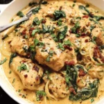 25-Minute Creamy Tuscan Chicken is a simple and quick recipe that’s quick to make and packed with flavor. This dish features chicken cooked in a creamy sauce made with coconut milk, sun-dried tomatoes, and fresh spinach. It’s an ideal meal for busy weeknights because it takes just about 25 minutes to prepare and cook. Plus, it is completely dairy-free, making it a perfect option for anyone who is lactose-intolerant or following a dairy-free lifestyle.