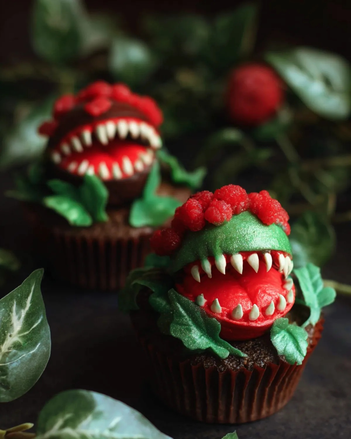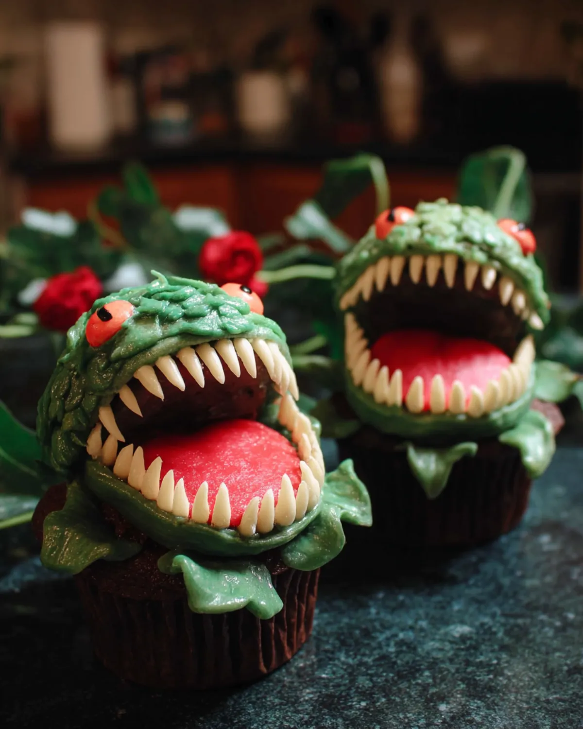 Delightful cupcakes inspired by the cult classic film, Little Shop of Horrors, perfect for Halloween celebrations.