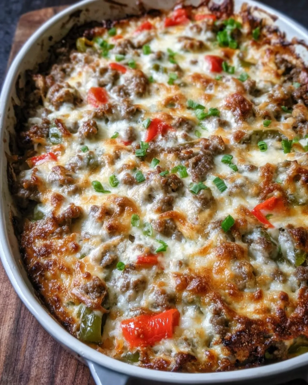 A delightful casserole combining ground beef, creamy cheeses, and fresh vegetables, perfect for any occasion.