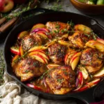 A delightful dish combining savory chicken with sweet apples and a rich pan sauce, perfect for family dinners or special occasions.