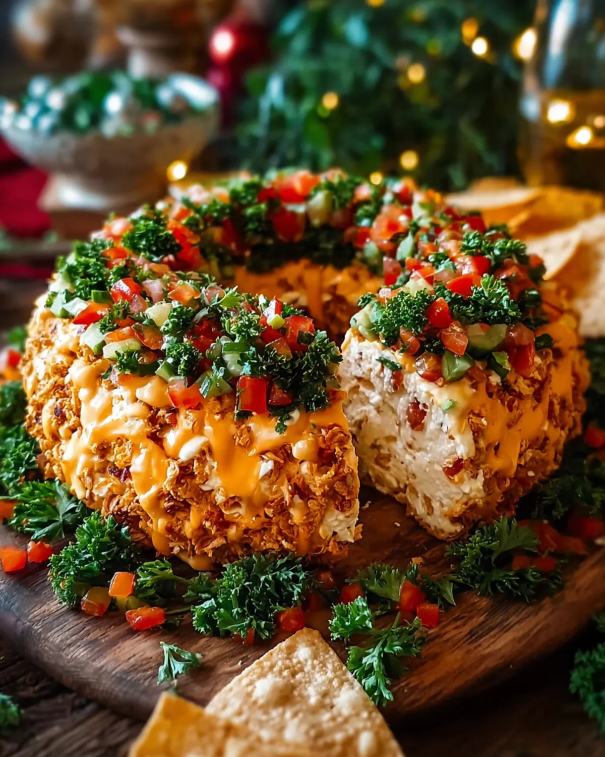 A fun and festive cheese ball centerpiece that combines creamy cheese with bold taco flavors, perfect for holiday gatherings.