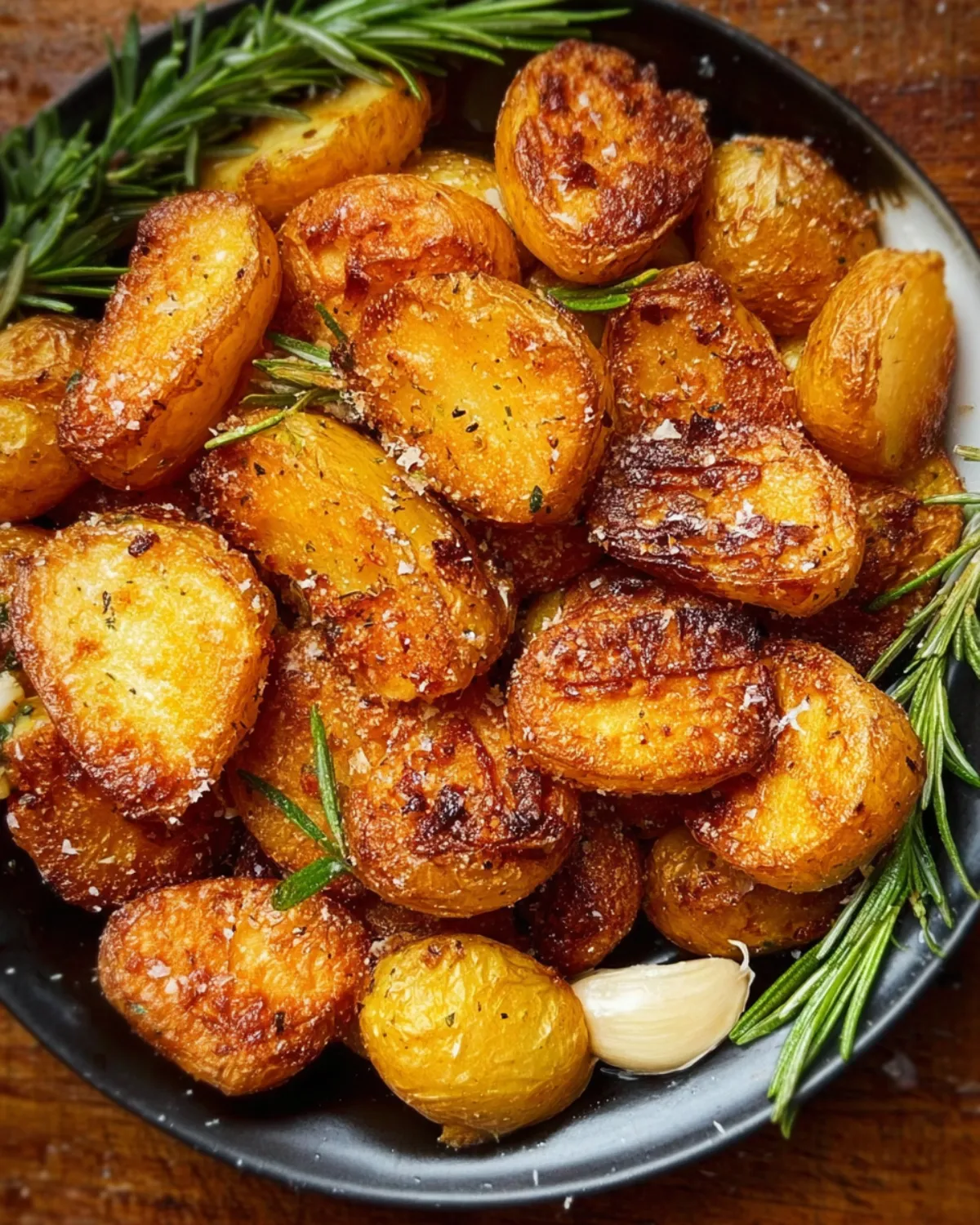 A delightful dish of crispy roast potatoes infused with fragrant garlic and fresh rosemary.