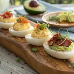 Avocado and chili oil may sound like a taco topping, but on deviled eggs? Game-changer. The buttery texture of avocado blends seamlessly with the creamy yolk filling, while the chili oil brings heat and aroma that elevate the entire bite. Together, they create a rich and zesty topper that screams “brunch with a twist.”