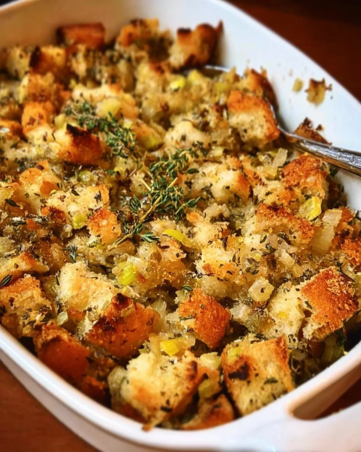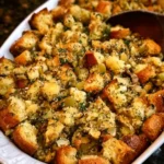 A comforting and flavorful herb stuffing made with fresh herbs, bread, and vegetables, perfect for any holiday meal.
