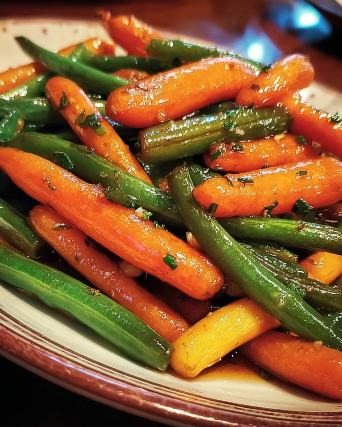 A simple and delicious side dish featuring tender carrots and fresh green beans coated in a shiny honey glaze.