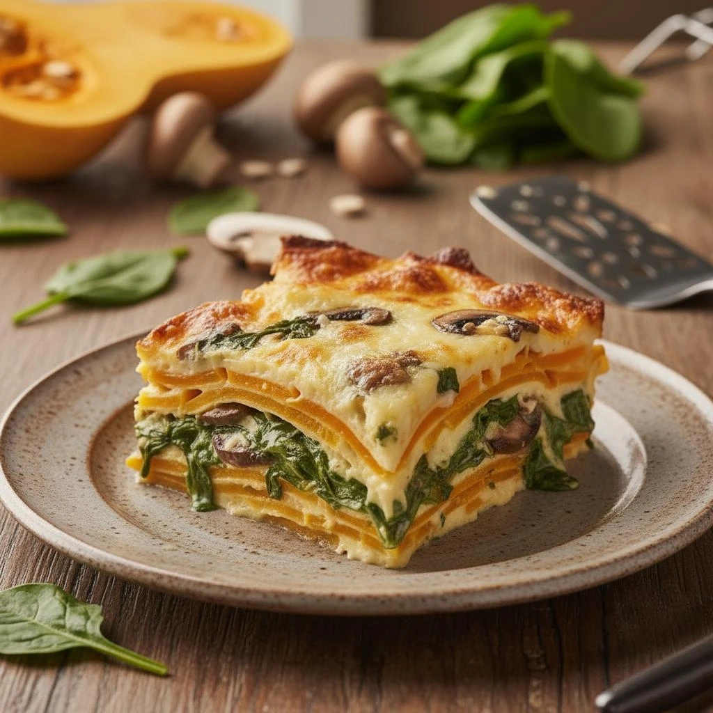 A comforting, cheesy, vegetable-packed lasagna made without pasta, using butternut squash and spinach in a creamy custard.