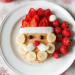 8. Decorate Your Santas: Take one pancake and place it on a plate. Cut strawberries in half and arrange them on top to resemble Santa’s hat. Use a banana slice as a pom-pom on the tip of the hat.