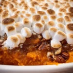 A warm, sweet, and creamy casserole featuring mashed sweet potatoes topped with gooey marshmallows and crunchy pecans, perfect for holidays.