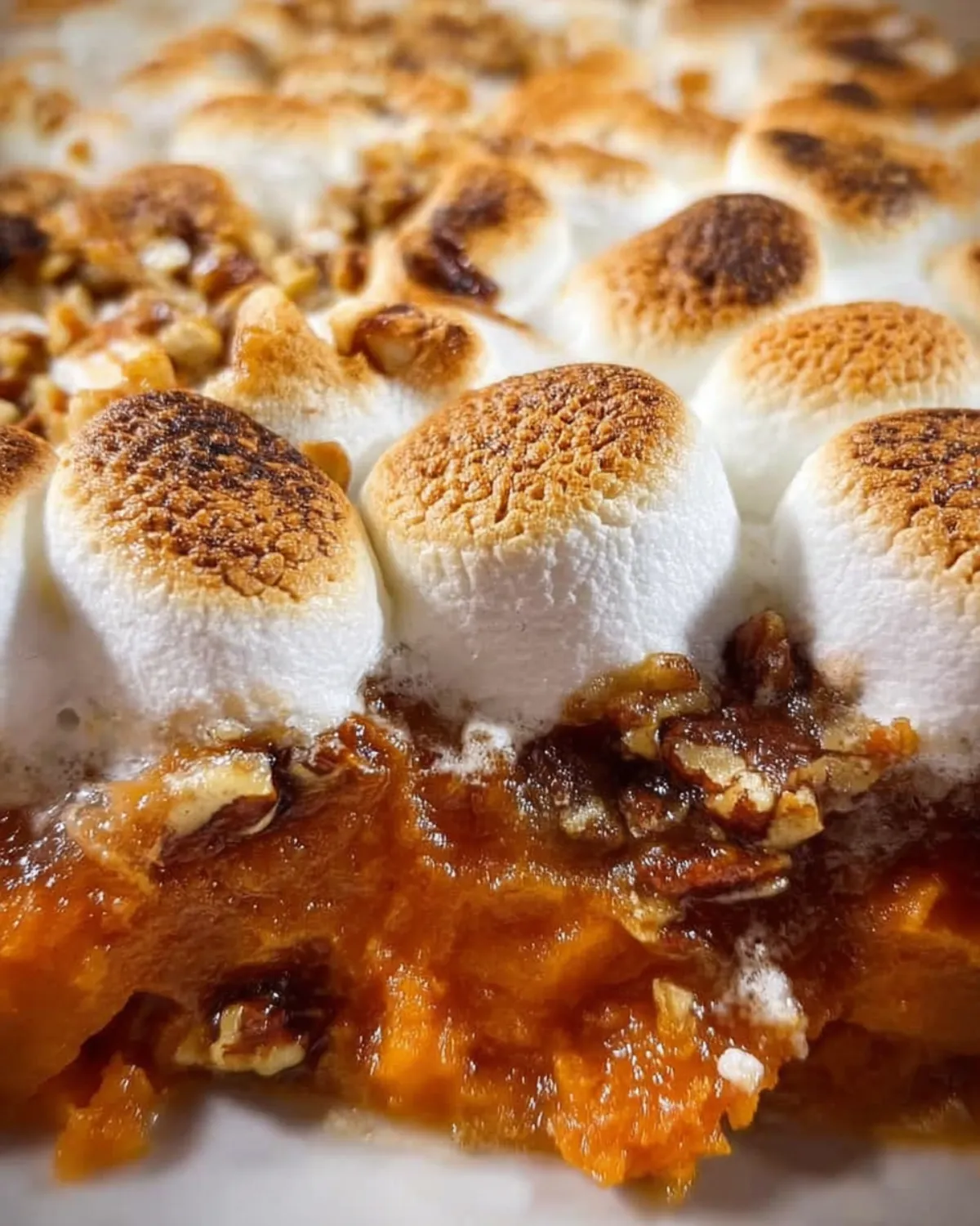 A warm, sweet, and creamy casserole featuring mashed sweet potatoes topped with gooey marshmallows and crunchy pecans, perfect for holidays.