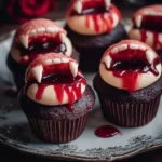 Fun and spooky Vampire Bite Cupcakes with rich chocolate flavor and a surprising strawberry filling, perfect for Halloween or any festive occasion.