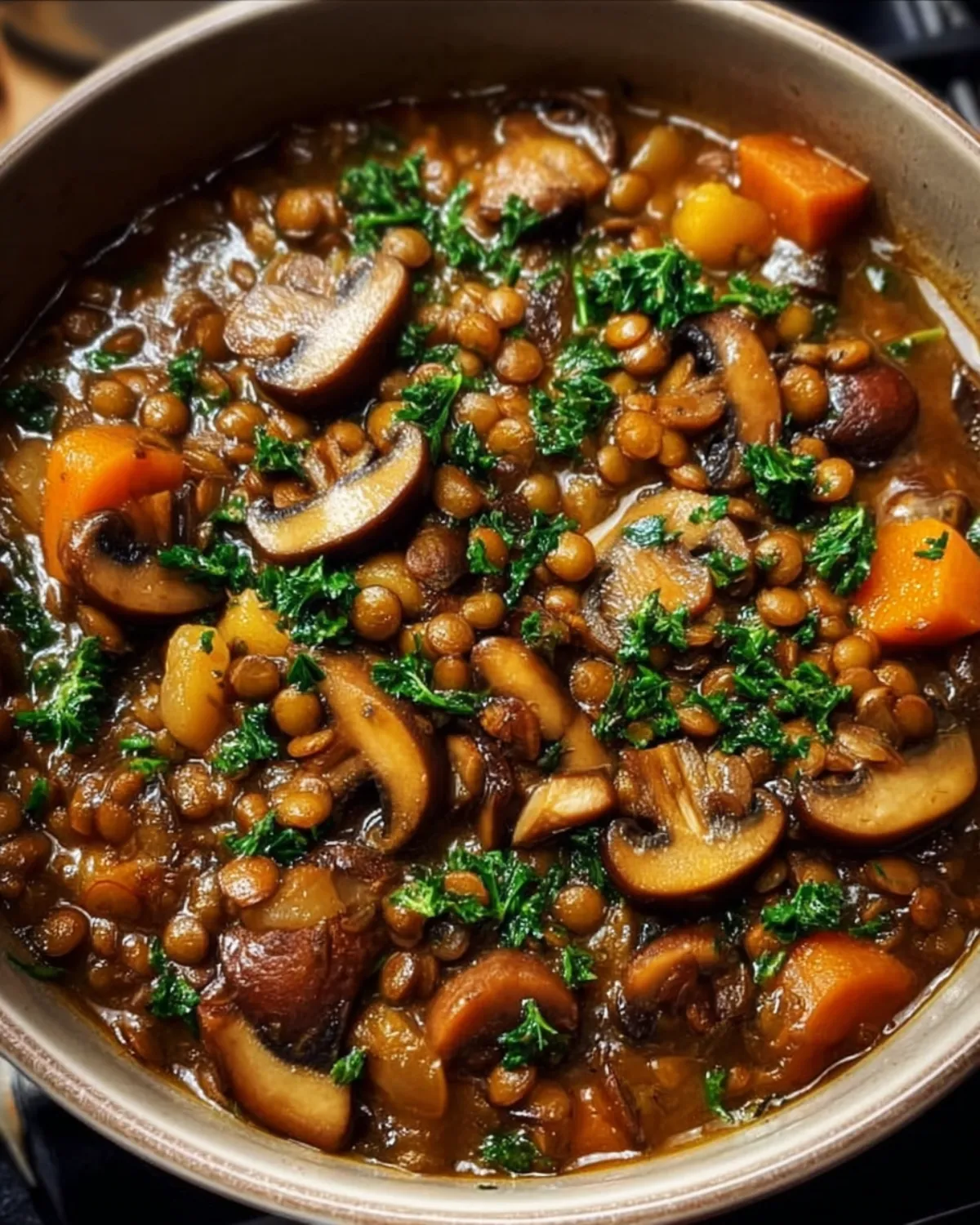 Keywords: vegan stew, lentils, mushrooms, healthy recipes, plant-based meals