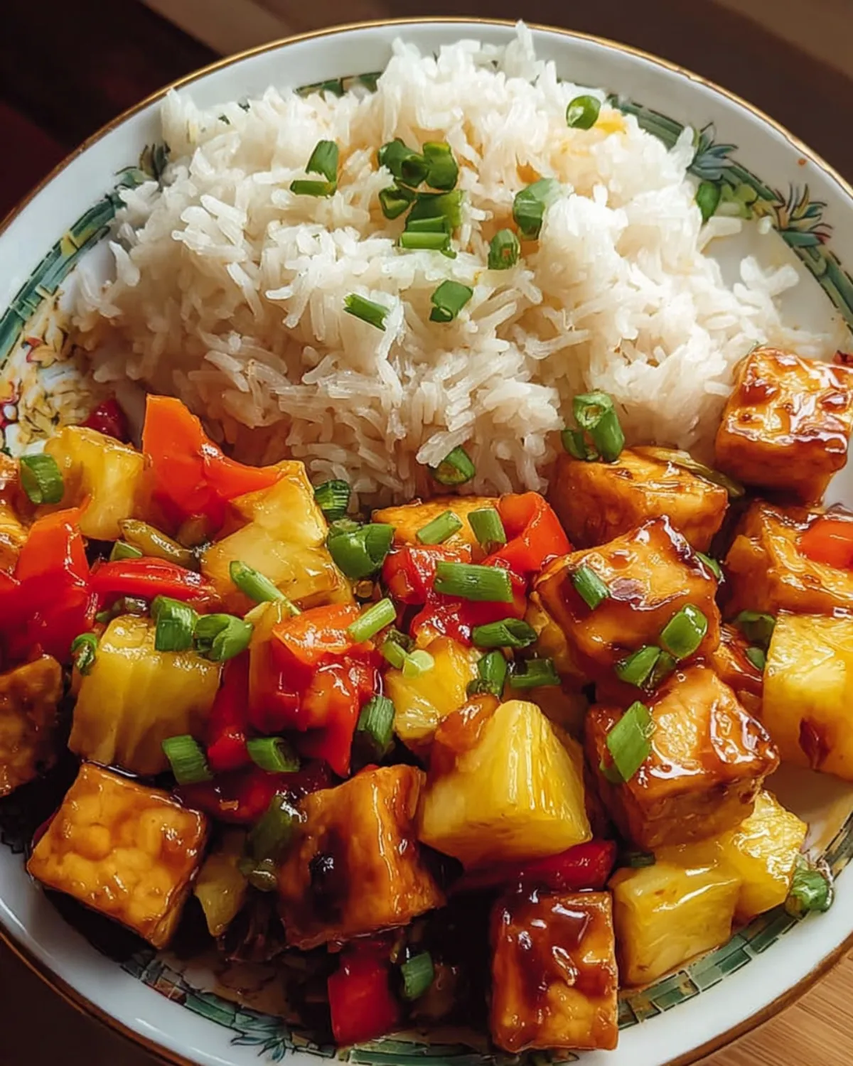 A delicious and colorful vegan dish combining crispy tofu with sweet, tangy pineapple and fresh vegetables.