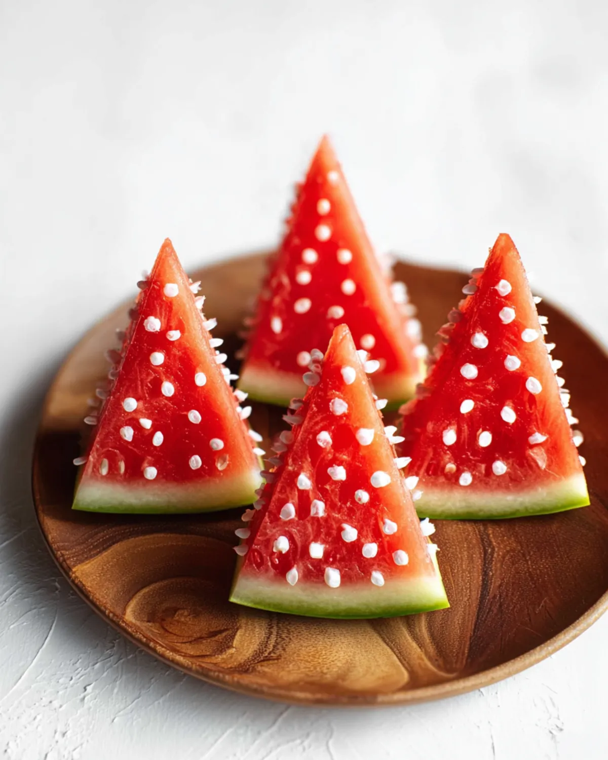 Watermelon Christmas Trees can be served on a festive platter. You can arrange them in a fun pattern or stack them for a playful look. They pair well with other holiday treats, like cookies or fruit salads. For added fun, you can sprinkle edible glitter or colorful sprinkles on top of the yogurt to make them sparkle.